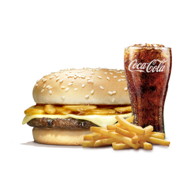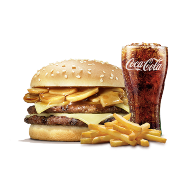 Deux fois plus de plaisir ! Des champignons au crémeux, du fromage goût fondu sur deux galettes de bœuf grillées à la flamme, nappées de la sauce champignon spéciale Burger King, le tout entre deux tranches de pain moelleux aux graines de sésame.