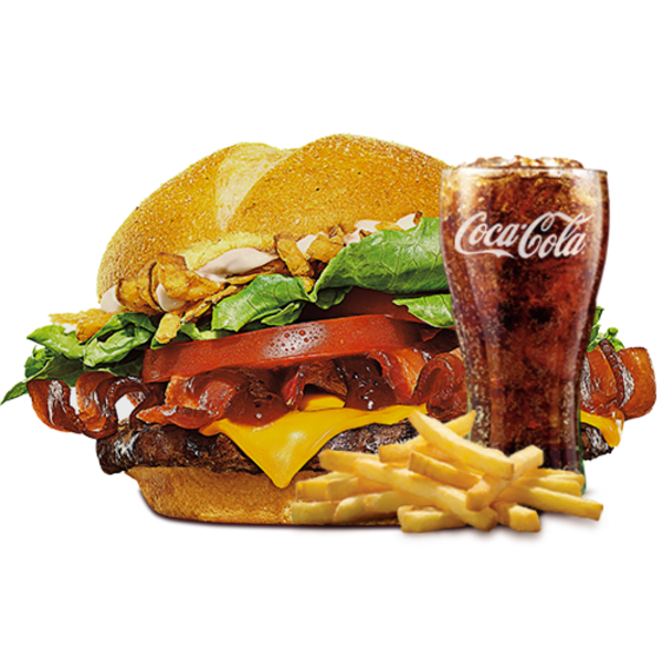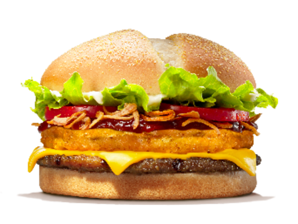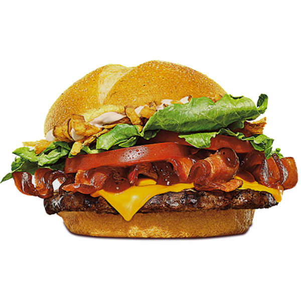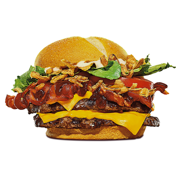 Doublez le plaisir de la nouvelle recette de notre Steakhouse, avec deux viandes de bœuf grillées à la flamme, du bacon de bœuf 100% Halal, des oignons croustillants et une délicieuse sauce barbecue.
